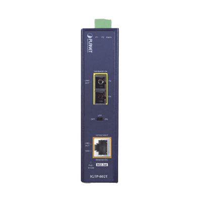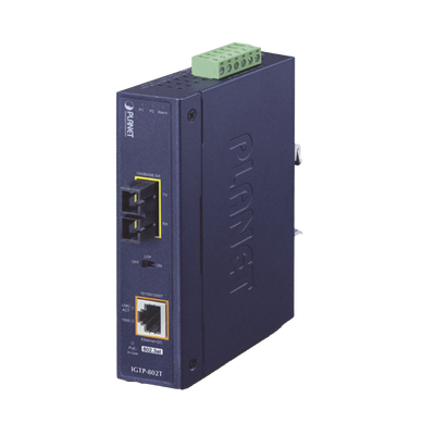 El convertidor de medios Gigabit industrial PLANET IGTP-80xT combina la conversi贸n de medios Ethernet con un inyector Power over Ethernet Plus (PoE+ 802.3at) para ofrecer hasta 30 vatios de potencia de salida y alta velocidad de transmisi贸n de datos a dispositivos instalados en 谩reas remotas donde se requiere una entrada de energ铆a suficiente y confiable.